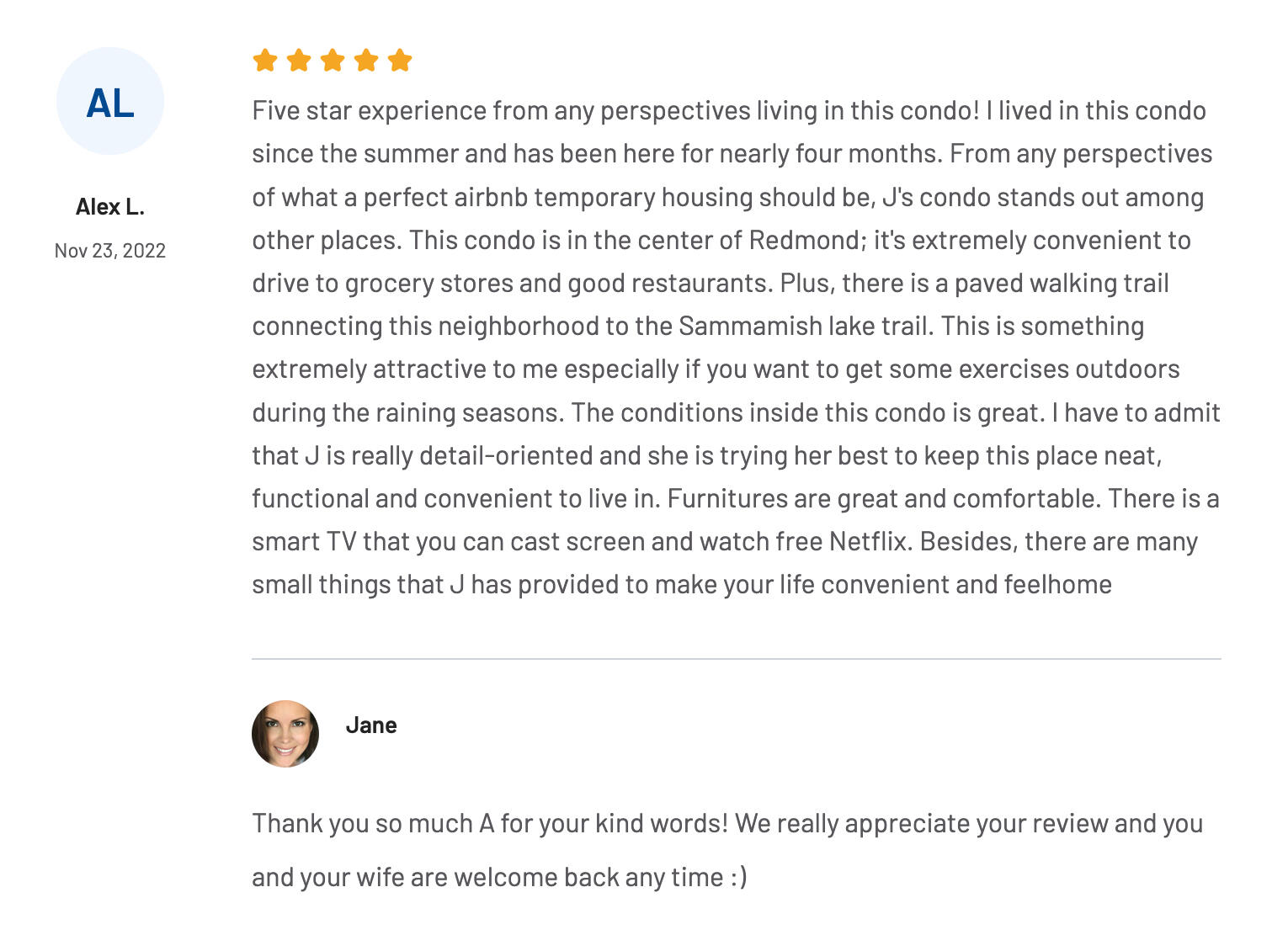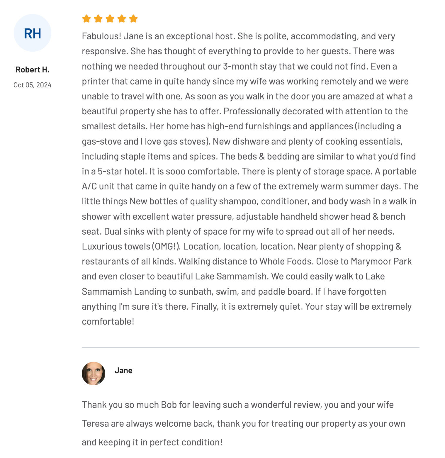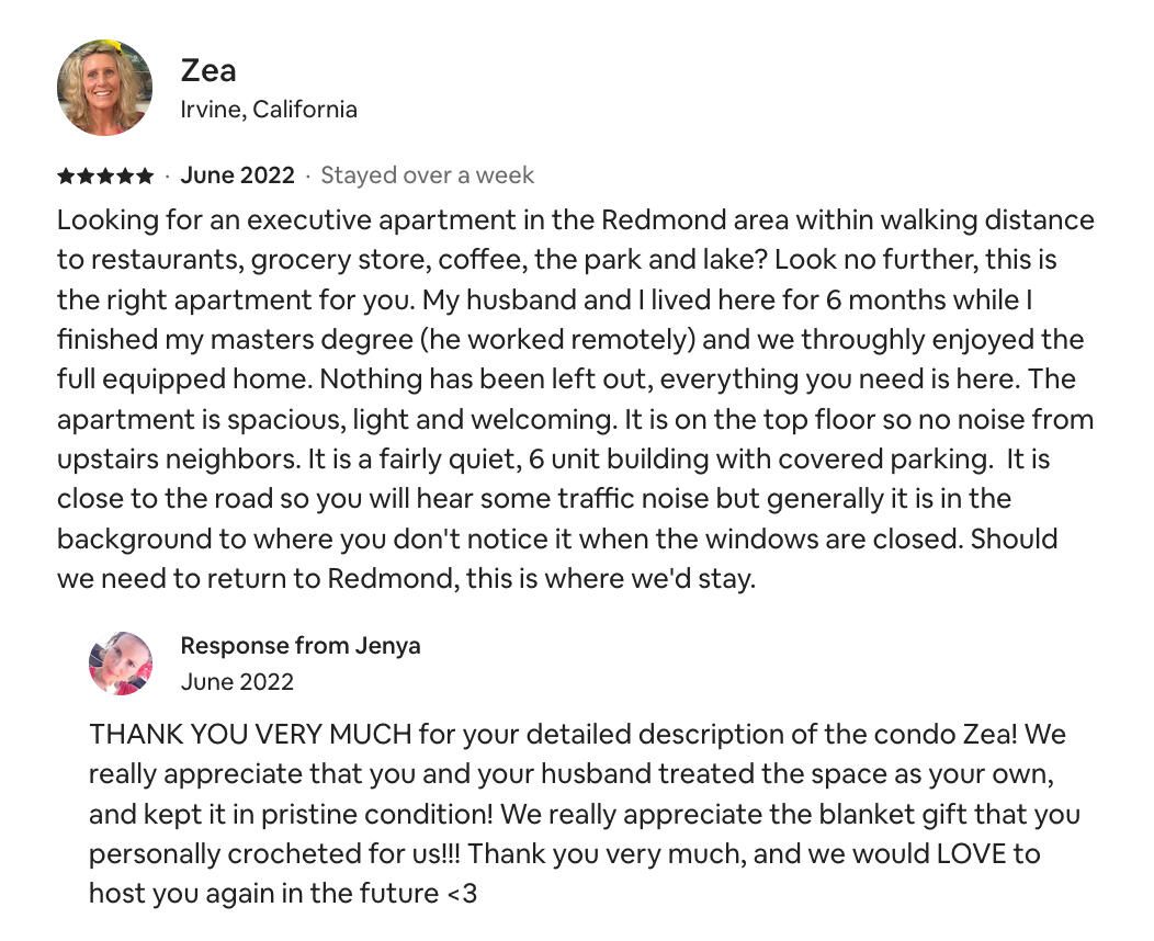 About the ResidenceModern, beautifully maintained 2-bedroom / 1-bath top-floor residence in Redmond — designed for extended stays, executive relocation, and comfortable everyday living.Located minutes to Microsoft, Marymoor Park, and the Sammamish River Trail, with quick access to Hwy 520 and the new Redmond Light Rail.Inside, you’ll find a bright, thoughtfully designed layout with a rare sense of privacy — only one neighboring unit — plus a curated, move-in-ready setup prepared to a consistent estate-level turnover standard.Comfort details matter here: upgraded sound-reduction windows and a portable A/C (for warm summer days) help the home feel calm, clean, and truly livable.📍 Close to Whole Foods, dining, parks, and major Eastside employers.